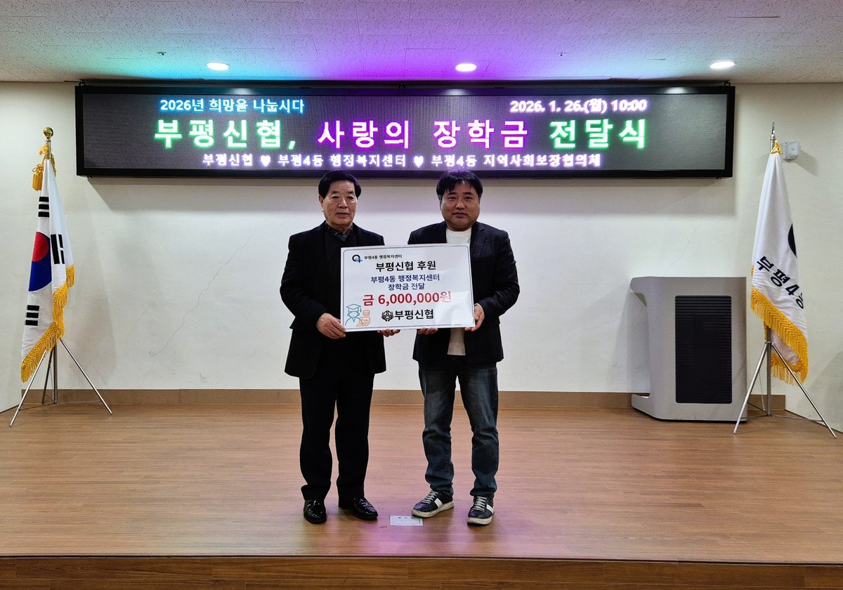[금요저널] 부평구 부평4동은 지난 26일 부평신협으로부터 인천사회복지공동모금회를 통해 청소년 장학금 600만원을 기탁받았다.