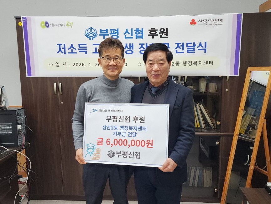 임동춘 삼산2동장은 “매년 따뜻한 나눔을 실천해 주시는 부평 신협에 깊이 감사드린다”며 “이번 장학금이 학생들에게 학업에 대한 의지를 북돋우는 계기가 되길 바란다”고 전했다.