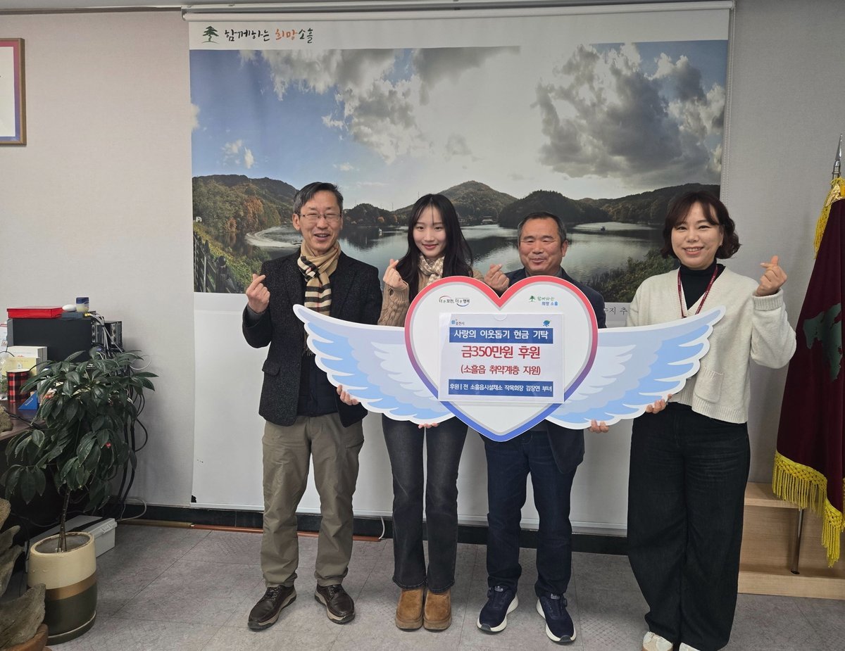 유재현 소흘읍장은 “어려운 이웃을 위해 따뜻한 나눔을 실천해 주신 솔그린농장에 깊이 감사드린다”며 “기탁해 주신 소중한 성금은 꼭 필요한 이웃들에게 정성껏 전달하겠다”고 전했다.