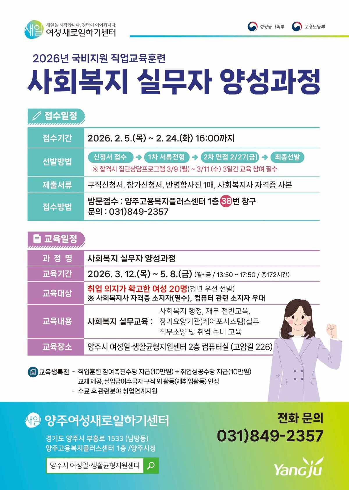 교육 참여를 희망하는 여성은 구직신청서와 참가신청서 반명함사진 1매, 사회복지사 자격증 사본을 지참해 양주고용복지플러스센터 1층 양주여성새로일하기센터를 방문해 신청하면 된다.