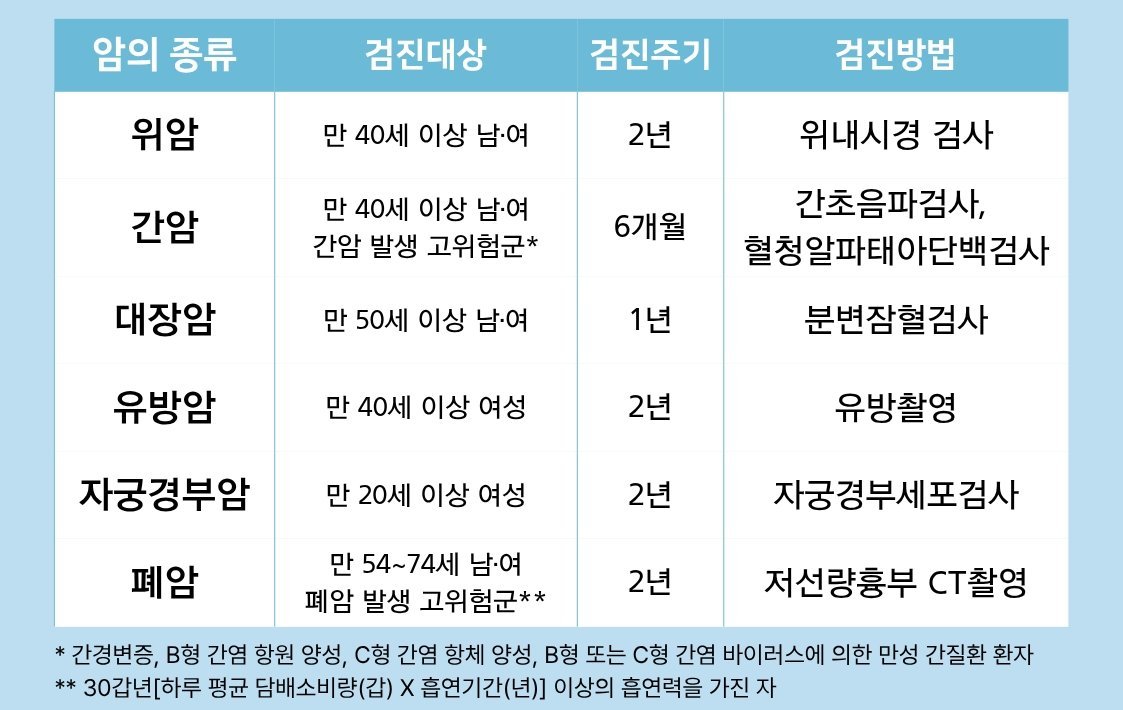 또한, 대장암과 자궁경부암은 대상자 모두에게 무료로 검진이 제공된다.