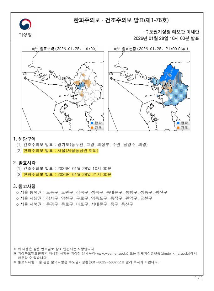 28일 밤 9시를 기점으로 서울 동남권을 제외한 3개 권역에 한파주의보가 발효됨에 따라, 서울시는 한파 종합지원상황실을 가동하고 자치구 및 유관기관과 협력해 시민 보호와 취약시설 안전관리를 강화한다고 밝혔다.