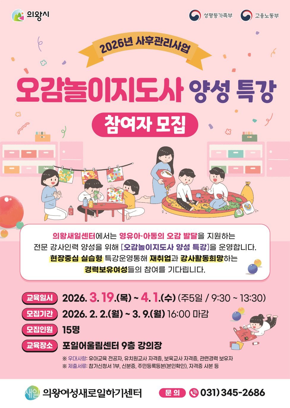 교육 신청은 3월 9일 오후 4시까지 의왕새일센터를 방문해 신청서를 제출하면 되며 최종 교육 대상자는 3월 12일 확정된다.