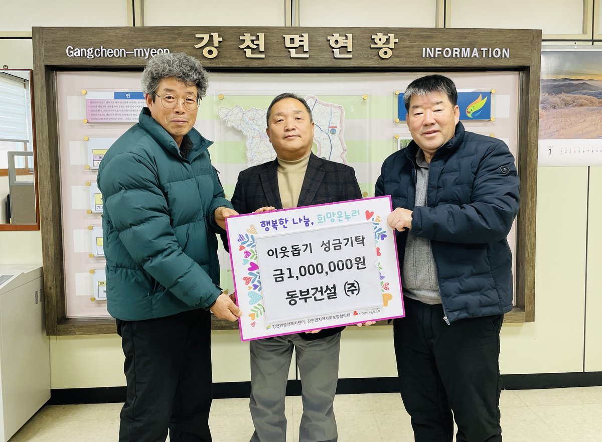 이에 배인수 강천면장은 "모두가 힘든 시기에 강천면민을 위해 따뜻한 정성을 보여주신 동부건설㈜에 진심으로 감사드린다"며 "전해주신 소중한 성금은 기탁자의 뜻을 받들어 관내 어려운 이웃들이 추운 겨울을 안전하고 따뜻하게 보낼 수 있도록 꼭 필요한 곳에 전달하겠다"고 답했다.