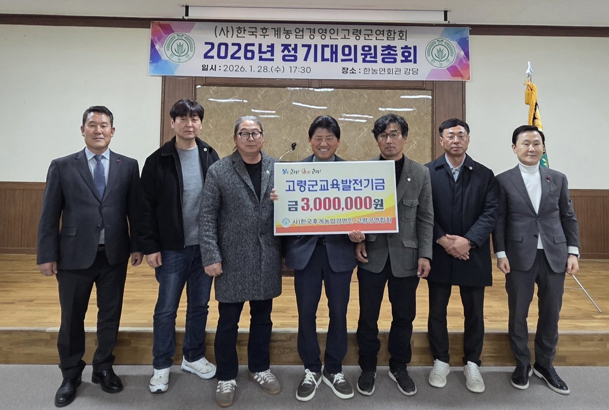 [금요저널] 사)한국후계농업경영인 고령군연합회는 1월 28일 고령군후계농업경영인회관에서 개최된 '2026년 한국후계농업경영인 고령군연합회 연시총회'에서 지역의 교육 발전과 인재 양성을 위해 사용해 달라며 교육발전기금 300만원을 기탁했다.