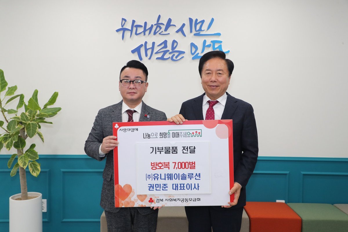 안동시는 1월 28일 시장실에서 권기창 안동시장과 ㈜유니웨이솔루션 권민준 대표이사가 참석한 가운데, 2026년 여름철 현장 작업자들의 안전을 위한 방호복 7000벌 기탁식을 가졌다고 밝혔다.