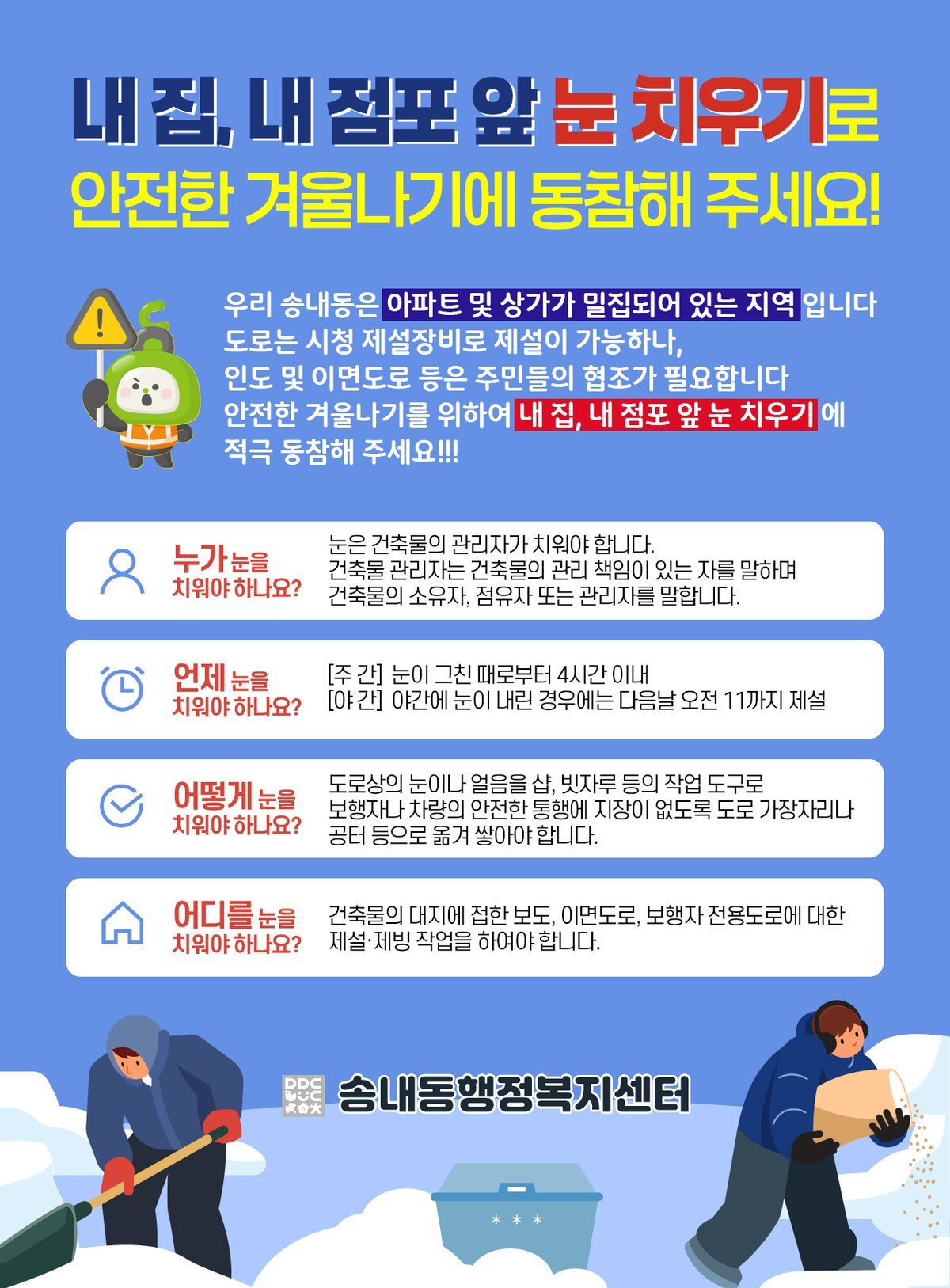 아파트와 상가 엘리베이터 게시판에 부착된 홍보물에는 구체적인 제설 시기와 방법이 담겼으며 향후 주민들이 제설 장비가 필요할 경우 송내동 행정복지센터에서 대여할 수 있도록 보완해 시민 참여 기반의 제설 체계를 강화할 예정이다.