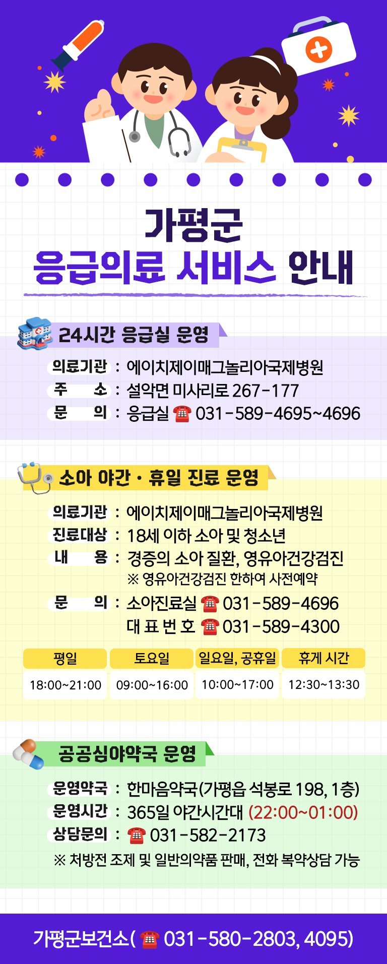[금요저널] 가평군은 24시간 응급실과 심야약국 운영, 협약병원 감면 혜택을 다시 한번 종합적으로 안내하며 군민들의 적극적인 이용을 당부했다.