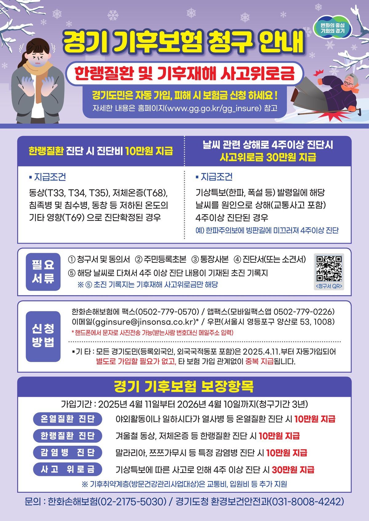 경기 기후보험에 대한 자세한 안내는 한화손해보험과 경기도청 환경보건안전과로 문의하면 된다.