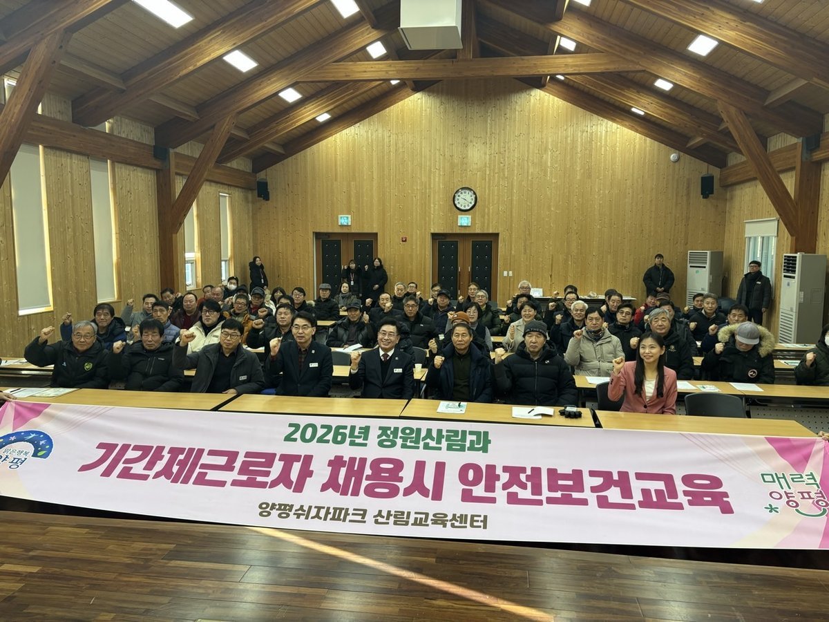 [금요저널] 양평군은 지난 29일 쉬자파크 산림교육센터에서 2026년 정원산림과 기간제근로자로 신규 채용된 근로자 55명을 대상으로 ‘산업안전보건법’에 따른 산업안전·보건 교육을 실시했다.