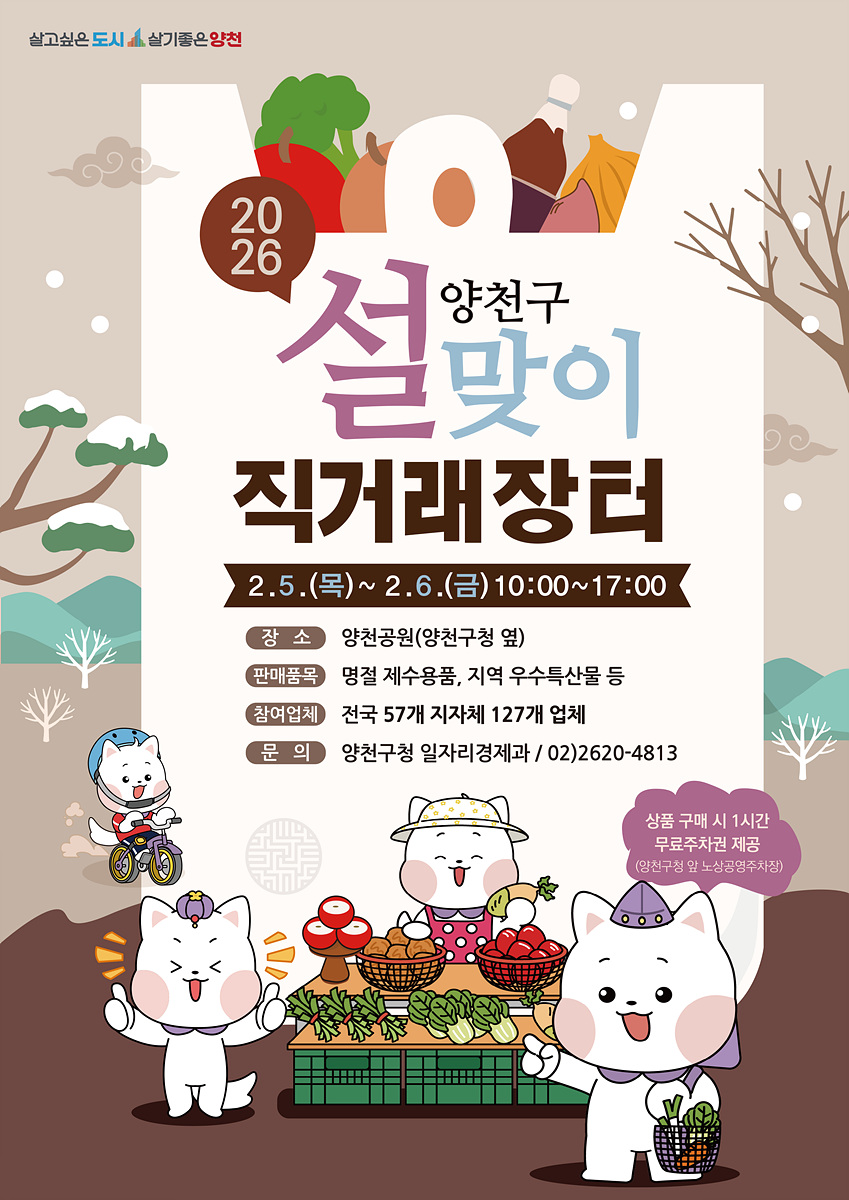 양천구(구청장 이기재)는 설 명절을 앞두고 장바구니 물가 부담을 덜고 지역 간 상생을 도모하기 위해 오는 2월 5일과 6일 이틀간 양천공원에서 ‘2026년 설맞이 직거래장터’를 운영한다고 1일 밝혔다.