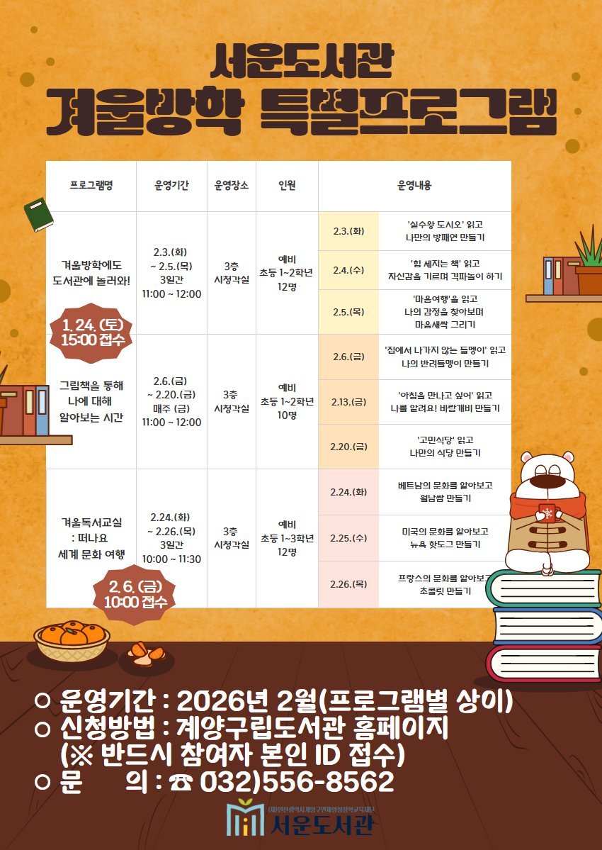 [금요저널] 인천 계양구 서운도서관은 2026년 겨울방학을 맞아 어린이를 위한 다양한 특강 프로그램을 운영한다.