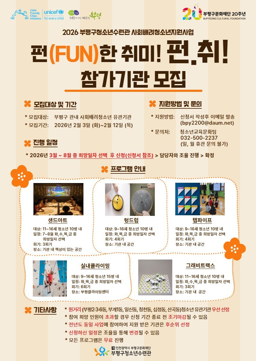 [금요저널] 부평구청소년수련관은 2026년 사회배려청소년지원사업 ‘펀한 취미, 펀.취’에 참여할 기관을 모집한다고 밝혔다.