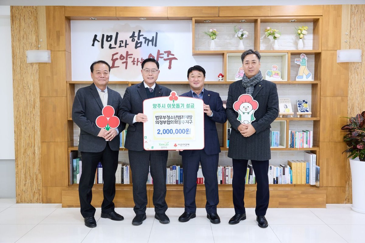 [금요저널] 양주시는 지난 30일 시장실에서 법무부청소년범죄예방 의정부협의회 양주지구로부터 이웃돕기 성금 200만원을 기탁받았다고 밝혔다.