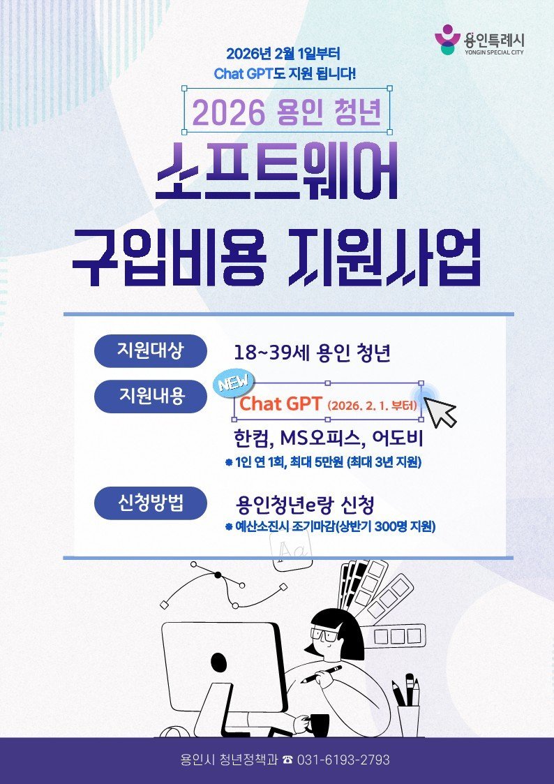 [금요저널] 용인특례시는 청년들의 디지털 역량 강화를 위해 ‘청년 소프트웨어 구입비용 지원사업’ 대상 품목에 ‘ChatGPT Plus’를 추가했다고 2일 밝혔다.