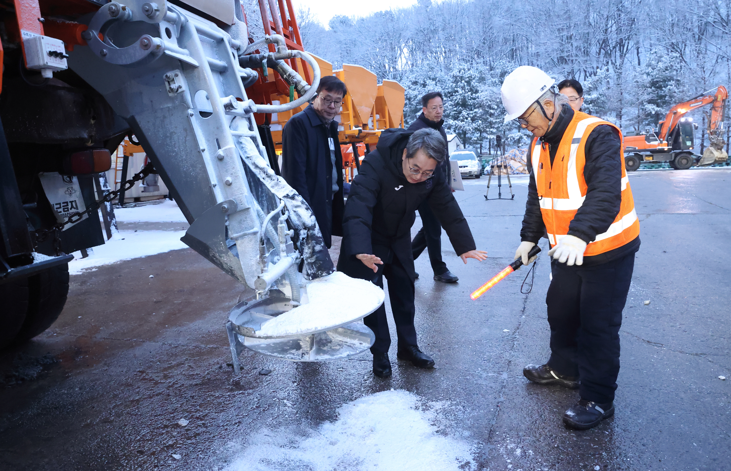 김동연 지사는 먼저 2일 아침 7시 반경 수원시 영통구 하동에 위치한 수원 제설전진기지를 찾아 밤사이 제설 현황을 살핀 후 대기실에서 작업자들과 담소를 나눴다.