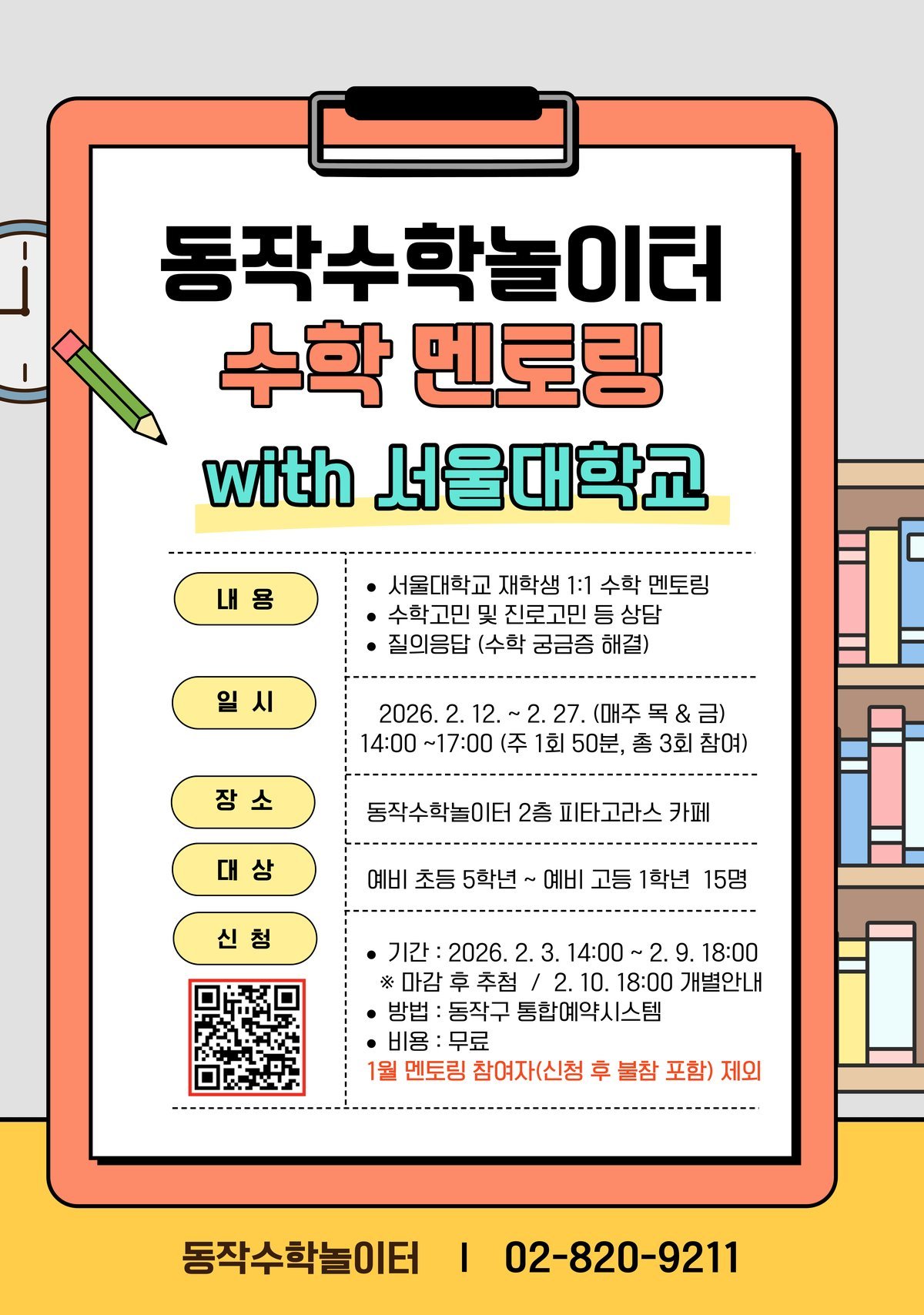 이달 12일부터 27일까지 매주 목요일과 금요일 동작수학놀이터 2층 피타고라스 카페에서 진행하며 학생의 학습 수준과 역량을 고려한 1:1 수학 학습지도 및 수학 학습 전략 상담 등 맞춤형 멘토링을 제공할 예정이다.