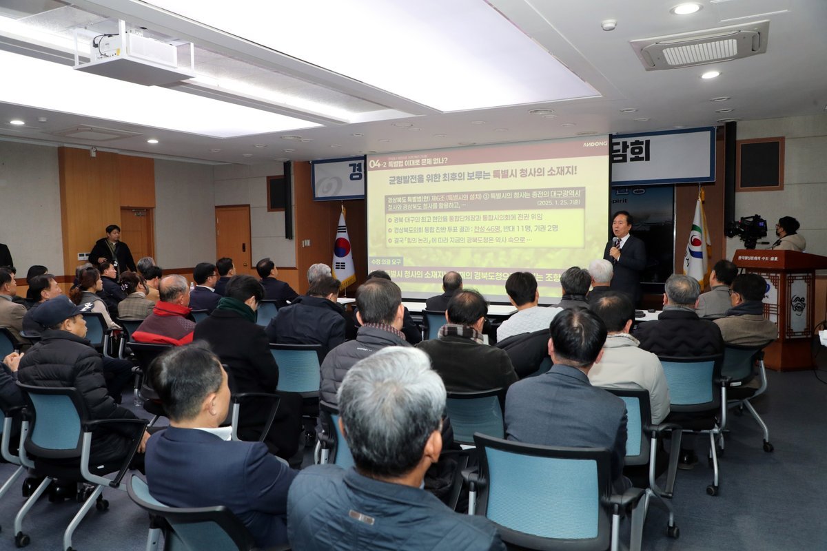 이 자리에서 권기창 안동시장은 행정통합과 함께 추진되고 있는 특별법과 재정 지원 방안과 관련해 △통합특별시 청사 소재지에 대한 명확한 기준 마련 △정부 재정지원의 법적 근거와 규모 명시 △광역 통합 이후 시․군․구로의 권한 및 재정 이양 범위 구체화 △도청 신도시 및 경북 북부권 발전을 위한 제도적 보장 필요성 등을 행정통합 논의의 선결과제로 설명했다.