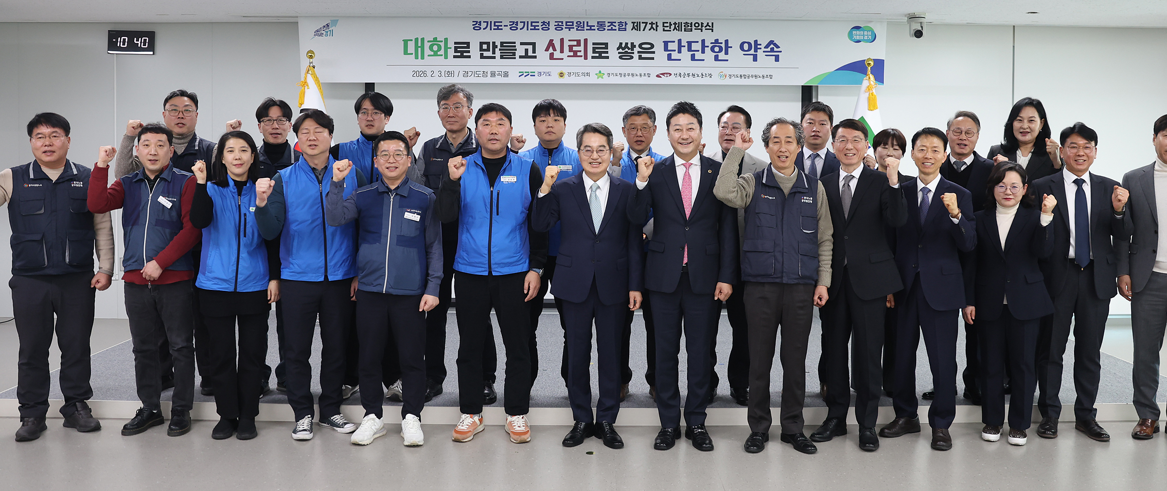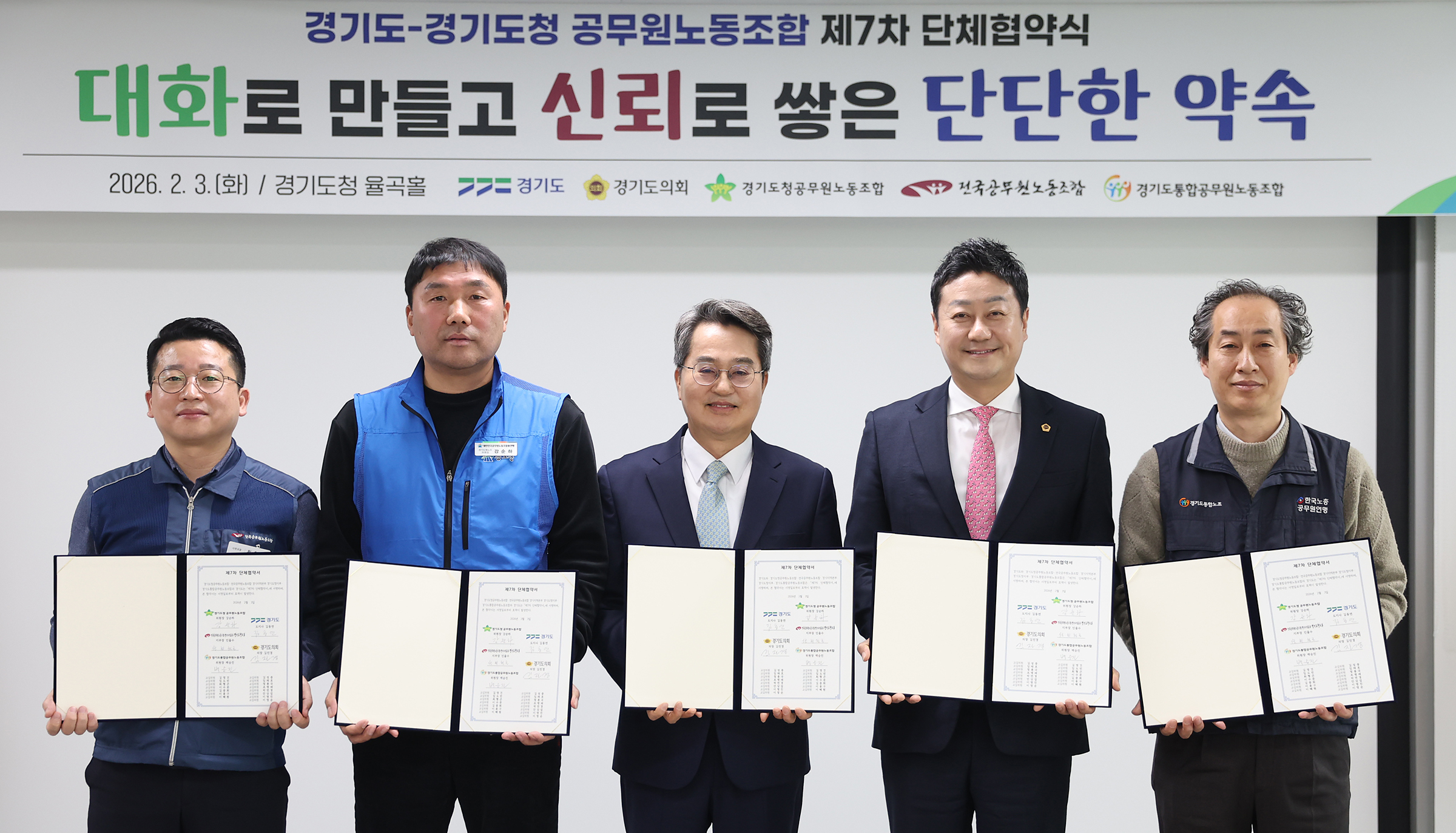 김동연 경기도지사와 김진경 경기도의회 의장, 강순하 경기도청공무원 노동조합 위원장, 백승진 경기도통합공무원노동조합 위원장, 최형곤 전국공무원노동조합 경기도청지부 사무국장은 3일 경기도청 율곡홀에서 제7차 단체협약서에 서명했다.