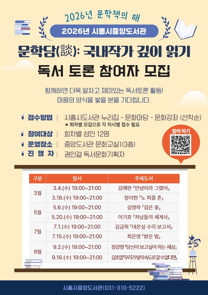 [금요저널] 시흥시중앙도서관은 ‘2026년 문학책의 해’를 맞아 국내 대표 문학 작가 소설을 주제로 한 독서토론 ‘문학담: 국내 작가 깊이 읽기’를 오는 3월부터 9월까지 운영한다.