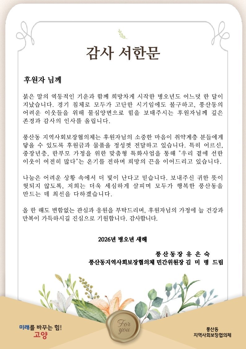 [금요저널] 고양특례시 일산동구 풍산동 지역사회보장협의체는 설명절을 앞둔 지난 3일 지난해 지역사회의 어려운 이웃을 위해 따뜻한 나눔을 실천한 후원자들에게 감사의 마음을 담은 서한문을 발송했다.