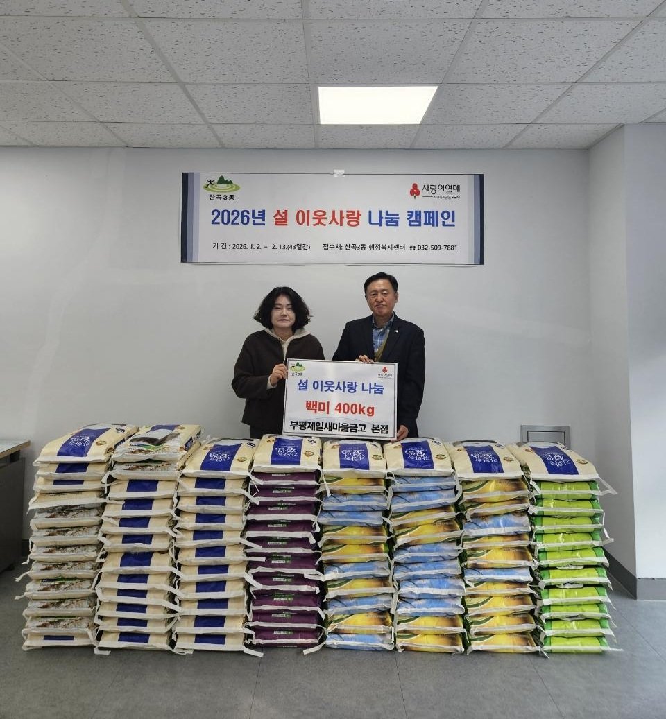 [금요저널] 부평구 산곡3동은 4일 부평제일새마을금고 본점으로부터 설 명절을 맞아 이웃사랑 나눔 백미 400kg을 기탁받았다고 밝혔다.