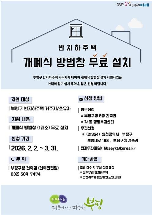 지원 대상은 부평구 내 반지하주택 거주자이며 방범창 설치는 전액 무료로 이뤄진다.