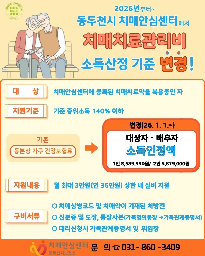 [금요저널] 동두천시 치매안심센터는 2026년 1월 1일부터 치매치료관리비 지원사업의 소득 산정 기준이 변경된다고 3일 밝혔다.