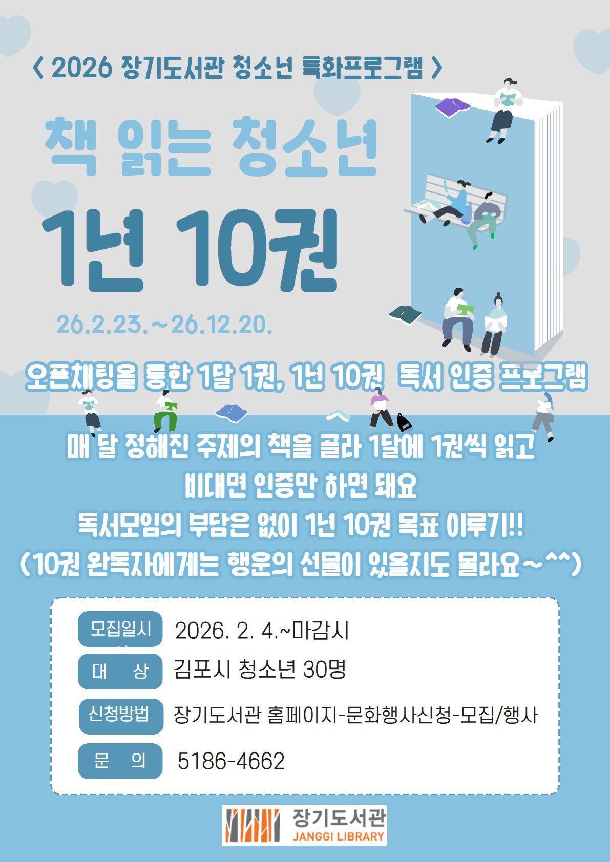 [금요저널] 김포시 장기도서관은 청소년의 자발적인 독서 습관 형성을 위해 청소년 특화프로그램 ‘책 읽는 청소년 1년 10권’을 오는 2월 23일부터 연말까지 운영한다.