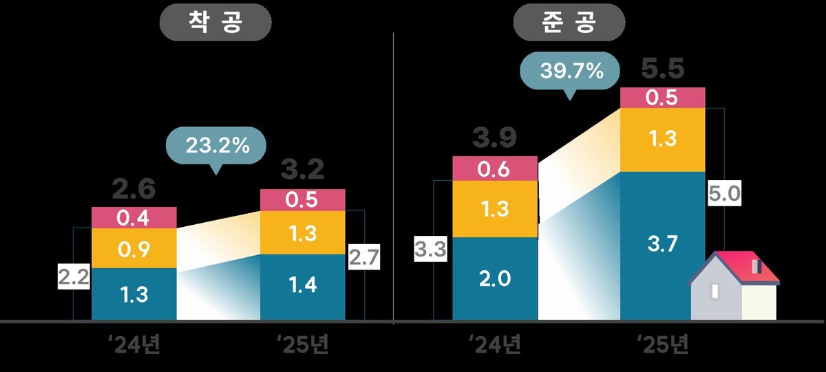 2025년 준공 물량은 5.5만 호로 전년 대비 39.7% 증가했으며, 이 중 5만 호가 아파트로 공급되었다.