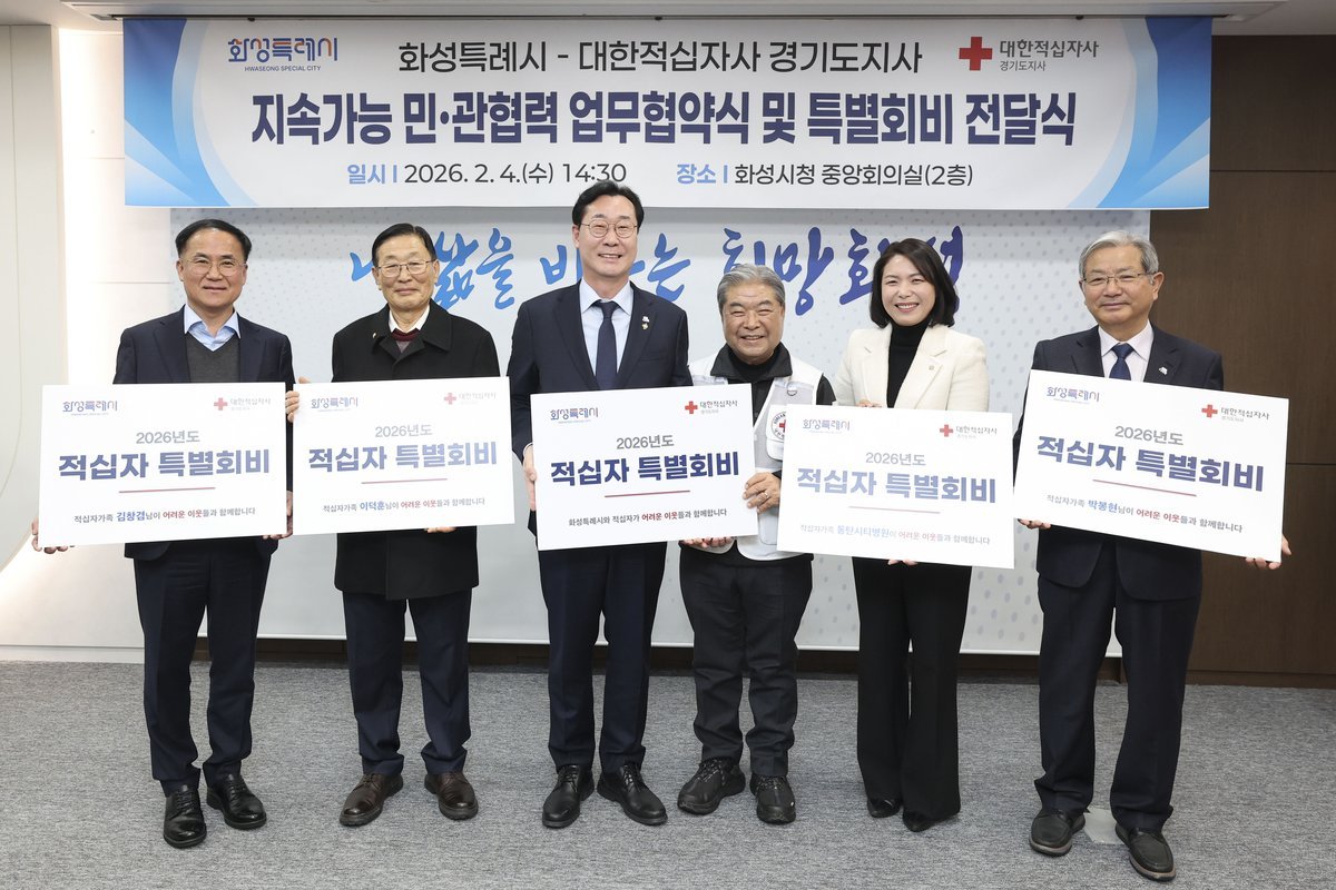 [금요저널] 대한적십자사 화성특례시지부 시범 운영 추진 재난구호·취약계층 지원 등 지역 인도주의 사업 협력 2026년도 적십자 특별회비 전달식 함께 진행 화성특례시와 대한적십자사 경기도지사가 4일 화성시청에서 지속가능한 민·관협력 거버넌스 구축을 위해 업무협약을 체결했다.