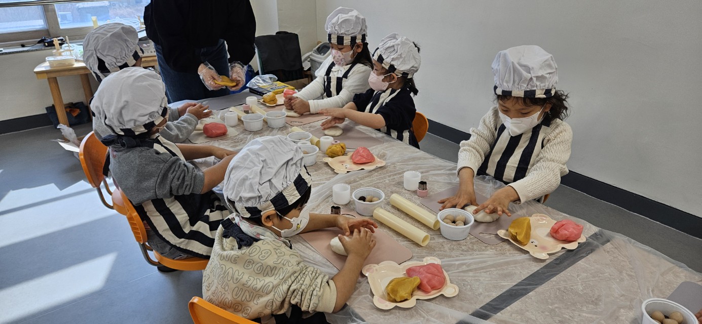 □ 그림책을 읽은 후에는 '바람떡 만들기' 확장활동이 이어졌다. 유아들은 호랭떡집에 전화로 주문하는 역할놀이를 시작으로, 직접 멥쌀을 치대어 쫀득한 떡반죽을 만들고 천연 재료인 치자, 호박, 쑥, 비트 가루로 다양한 색깔의 떡을 완성하였다. 팥앙금을 동그랗게 빚어 넣고 밀대로 반죽을 펼친 후 모양틀로 찍거나 자유롭게 모양을 만들며 창의성을 발휘하였다.