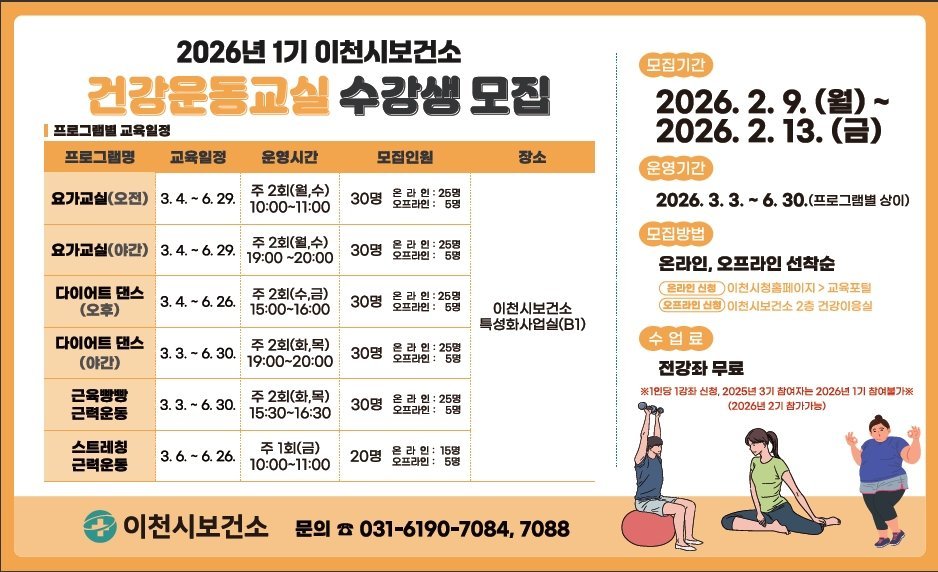 [금요저널] 이천시보건소는 시민들이 건강생활을 실천할 수 있도록 ‘2026년 건강운동교실 1기’참여자를 선착순으로 모집한다.