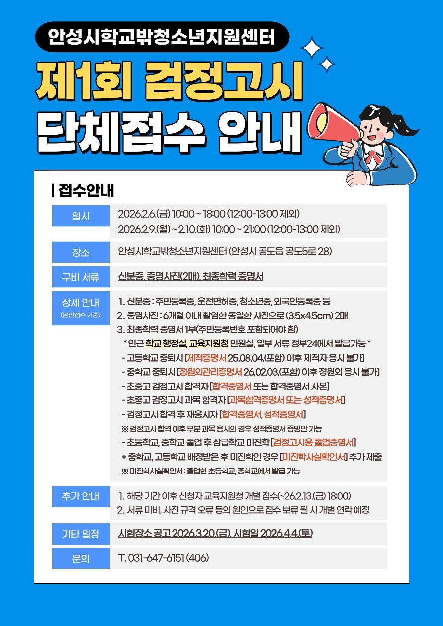 [금요저널] 안성시학교밖청소년지원센터는 오는 4월 4일 시행되는 2026년도 제1회 검정고시와 관련해 단체원서접수를 진행한다고 밝혔다.
