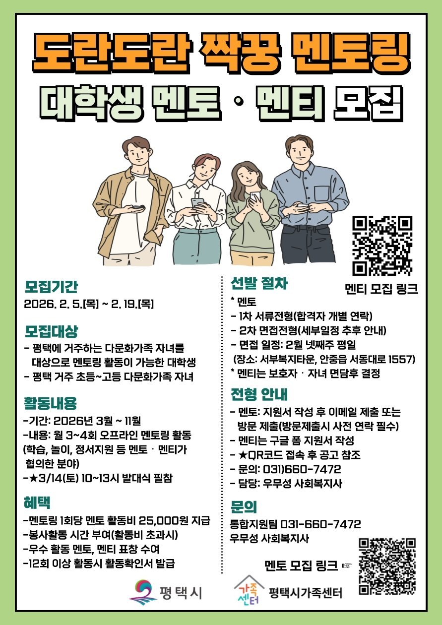 [금요저널] 평택시가족센터는 2월 5일부터 19일까지 다문화가족 자녀 대상 ‘도란도란 짝꿍 멘토링’에 참여할 대학생 멘토와 멘티를 모집한다.