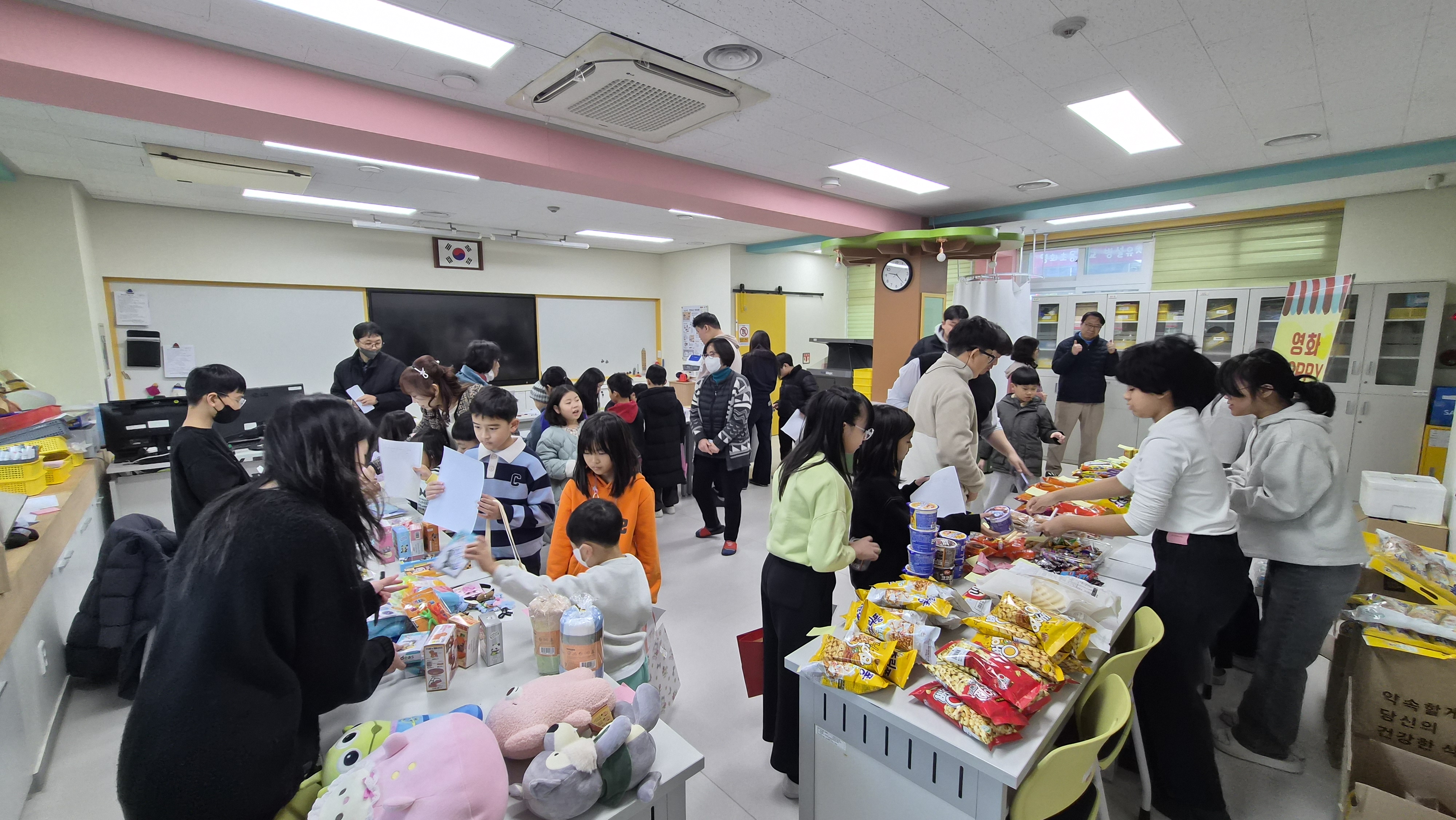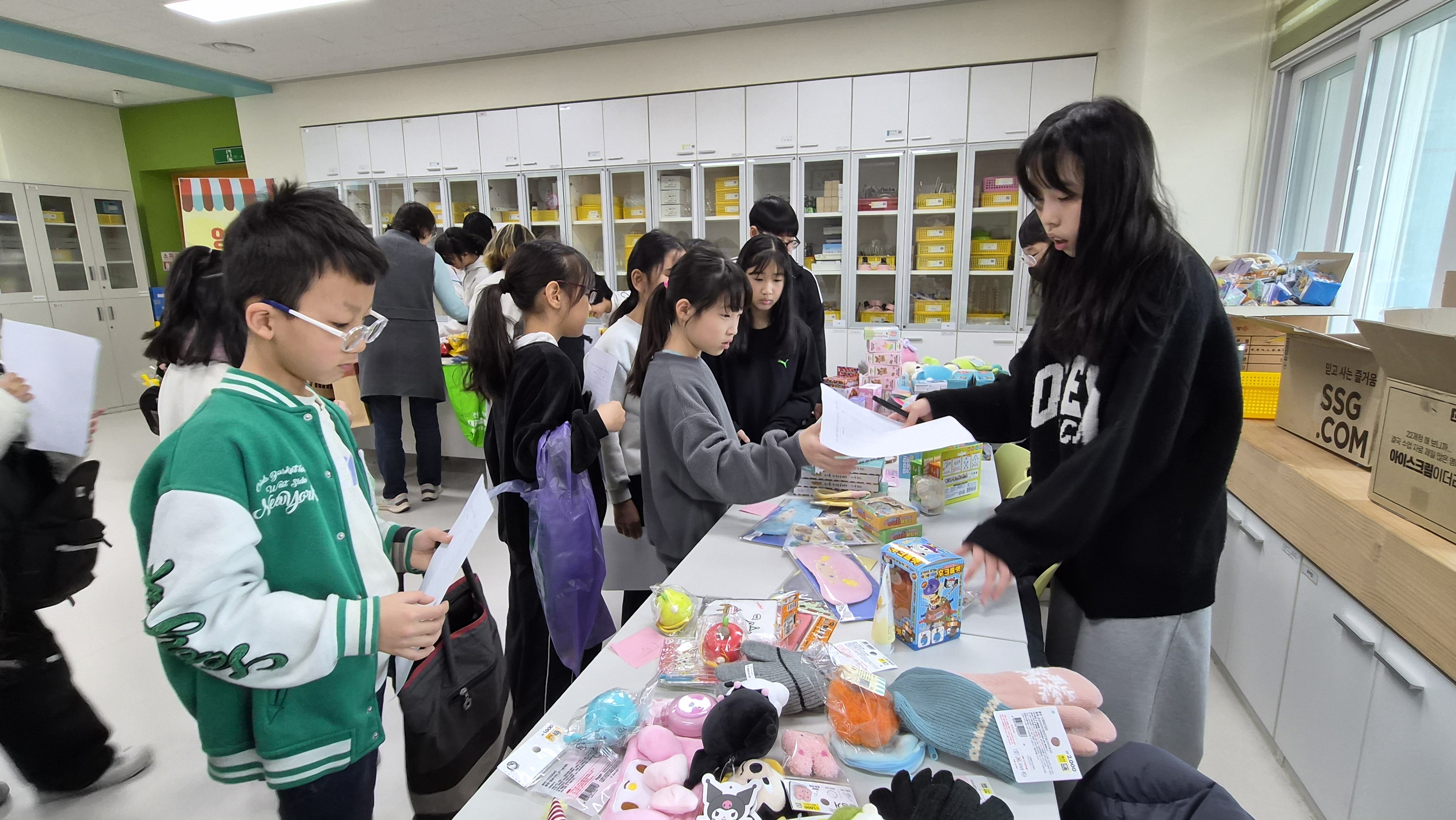 □ 학생들은 1년 동안 스스로 마일리지를 적립하고, 행사 당일 원하는 물품을 선택해 구매하였다. 또한 5~6학년 전교어린이회 임원과 학급 도우미들이 물품 진열과 가격 설정, 판매 활동, 통장 확인 등에 참여하여 행사 전반이 학생 주도적으로 운영되었다. 특히 이번 해피업마켓에는 전교생뿐만 아니라 전 교직원도 함께 참여하여 소통과 나눔이 있는 학교 공동체 문화를 조성하는 데 기여하였다.