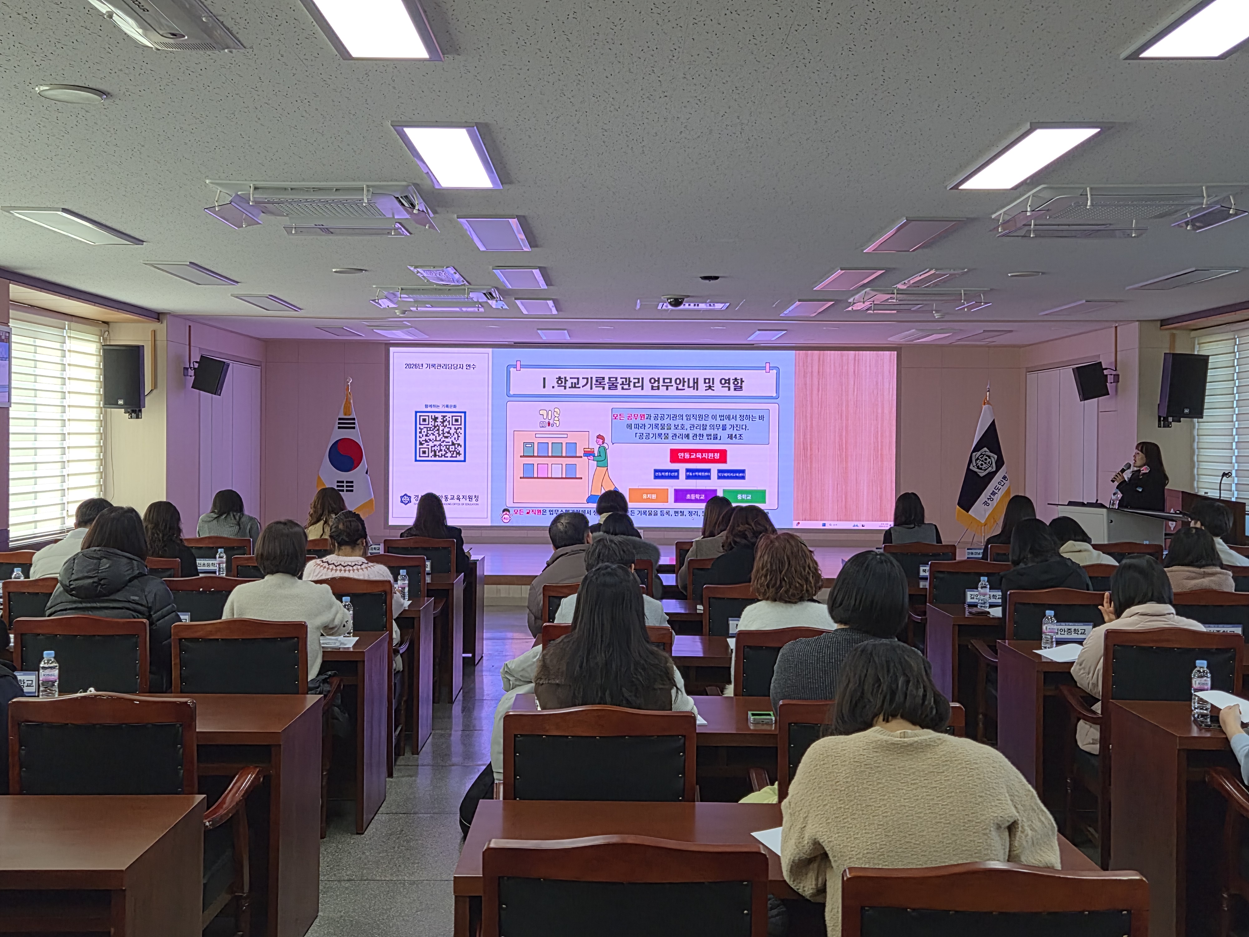 안동교육지원청(교육장 홍성중)은 2월 5일(목) 안동교육지원청 3층 대회의실에서 관내 각급 학교 및 소속 기관 기록물관리 담당자 50여명을 대상으로 기록물관리 담당자 역량강화 연수를 실시했다. 이번 교육은 기록관리 업무가 적기에 추진될 수 있도록, 분기별 핵심 업무 및 상설업무에 대한 각 담당자의 업무 이해도와 실행력을 강화하기 위해 마련됐다.