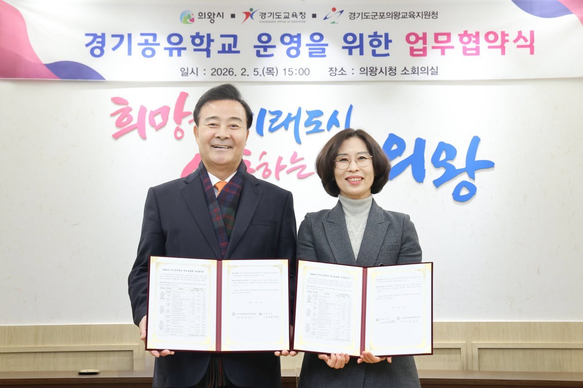[금요저널] 의왕시가 2월 5일 의왕시청 소회의실에서 경기도교육청·군포의왕교육지원청과 ‘경기공유학교 운영을 위한 업무협약’을 체결했다.