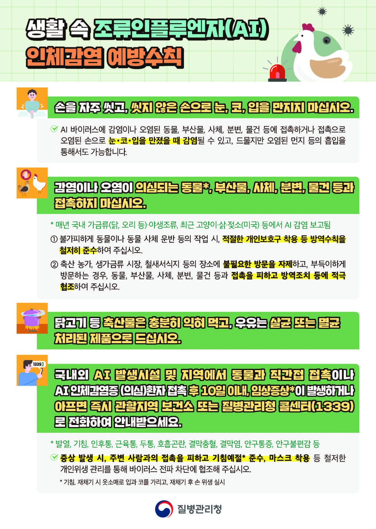 인체감염 예방을 위해서는 △손을 자주 씻고 씻지 않은 손으로 눈·코·입을 만지지 않기 △감염 또는 오염이 의심되는 동물과 부산물, 사체, 분변, 오염된 물건과 접촉하지 않기 △닭고기 등 축산물은 충분히 익혀 섭취하고 우유는 살균·멸균 처리된 제품을 마시기 등 기본적인 예방수칙을 철저히 지켜야 한다.