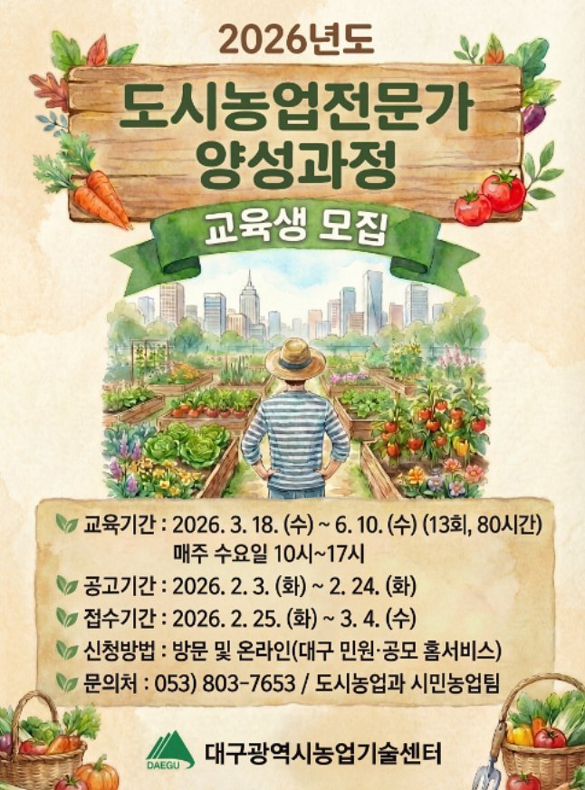 [금요저널] 대구광역시농업기술센터는 단순한 농사 기술 습득을 넘어 도시 생태계 보전과 정서 함양 등 도시농업을 선도할 시민을 대상으로 ‘2026년도 도시농업전문가 양성과정’을 운영한다.