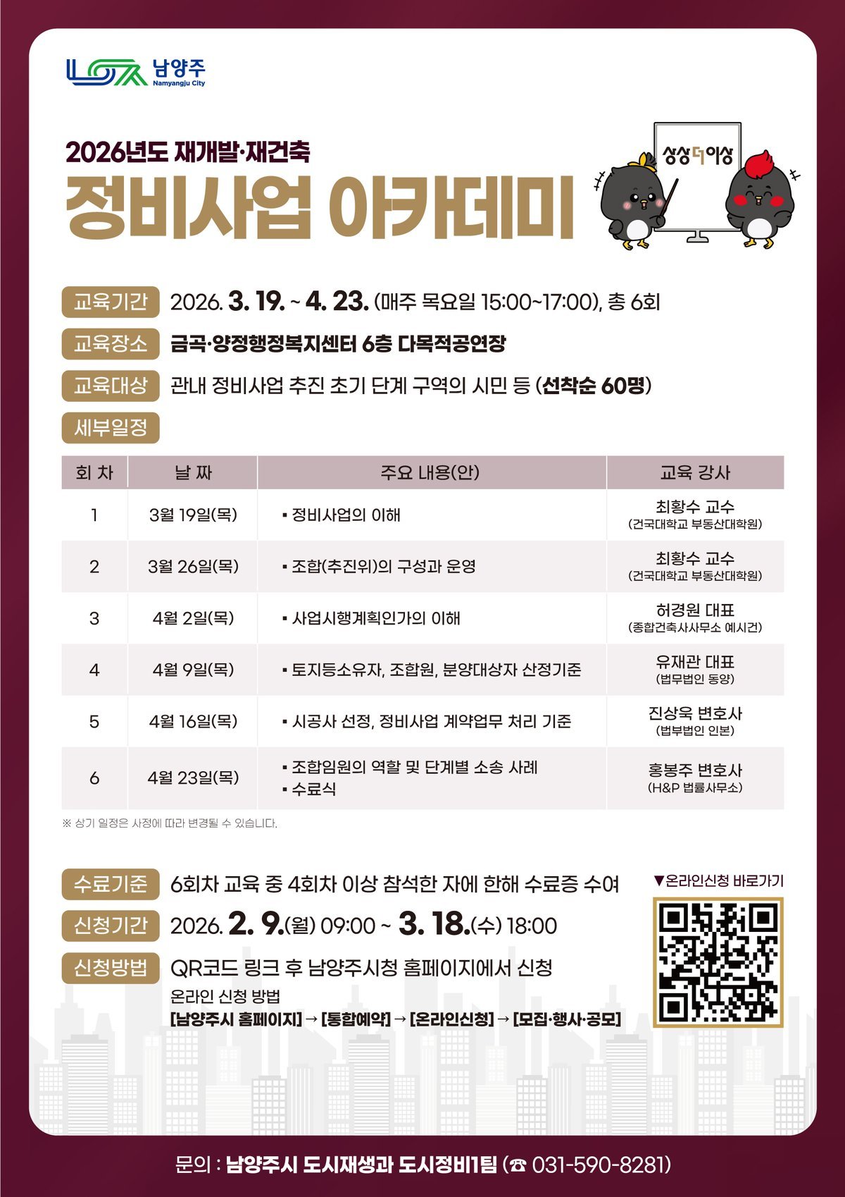 강의는 △정비사업 개념 △추진위원회와 조합의 구성·운영 △사업시행계획 인가 절차 △토지 등 소유자와 조합원 자격 기준 △시공사 선정 기준과 계약 업무 △조합 임원의 역할과 관련 소송사례 등 실무 중심으로 운영된다.