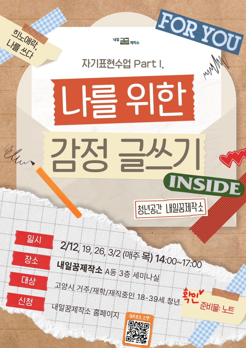 [금요저널] 고양특례시는 오는 2월 12일부터 매주 목요일 4주간, 고양시 청년공간 ‘내일꿈제작소’에서 관내 청년들의 마음돌봄을 위한 ‘감정글쓰기’프로그램을 진행한다고 밝혔다.