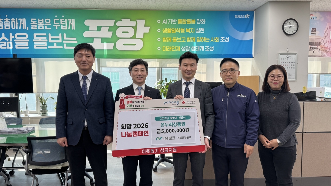 이번 기탁은 iM뱅크 경북동부본부가 설 명절을 앞두고 지역사회와의 유대감을 강화하고, 소외된 이웃들이 풍성한 명절을 보낼 수 있도록 실질적인 도움을 주기 위해 마련됐다. 기탁된 상품권은 설 연휴 전까지 지역 내 취약계층 50세대에 전달돼 명절 준비를 도울 예정이다.