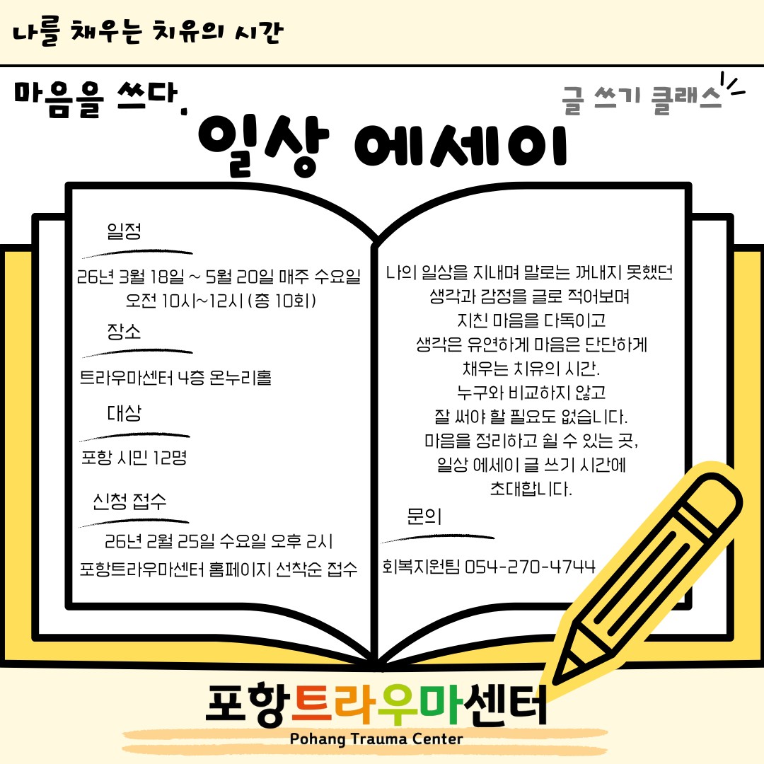 포항시 북구보건소 트라우마센터는 문학 치유 프로그램인 ‘2026년 마음을 쓰다: 일상 에세이’ 글 쓰기 참여자를 모집한다.