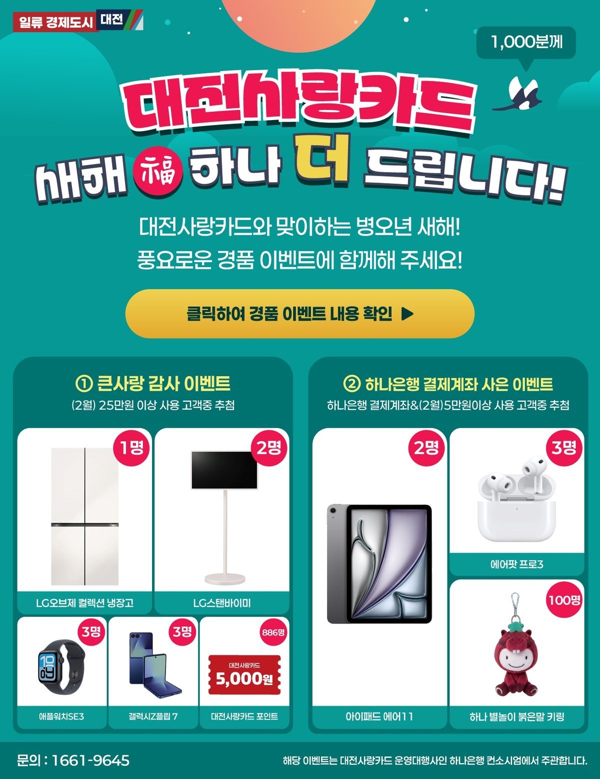 또한 대전사랑카드 결제계좌가 하나은행이면서 5만원 이상 사용한 고객 105명에게는 스마트패드와 무선이어폰 등 추가 경품을 증정한다.