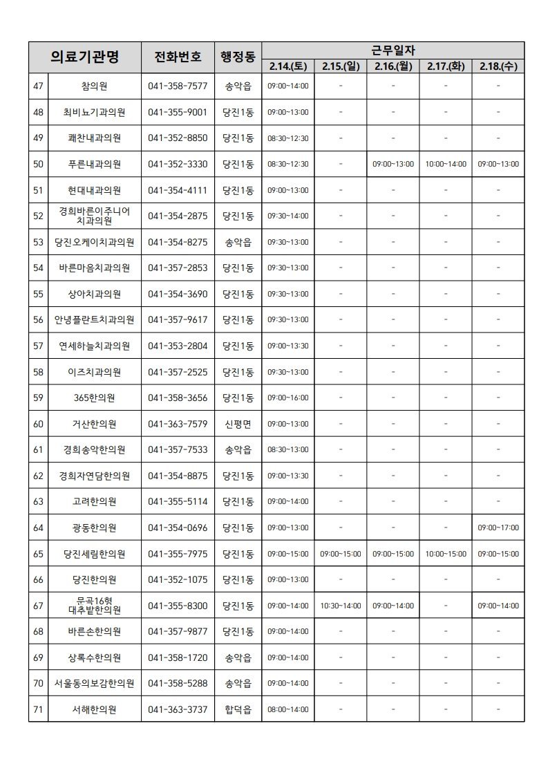 이번 연휴 기간 중 당진종합병원 응급실은 24시간 비상진료 체계를 유지하며, 시민들의 진료 편의를 위해 관내 병의원 70여 개소와 약국 30여 개소가 지정된 날짜에 문을 연다.