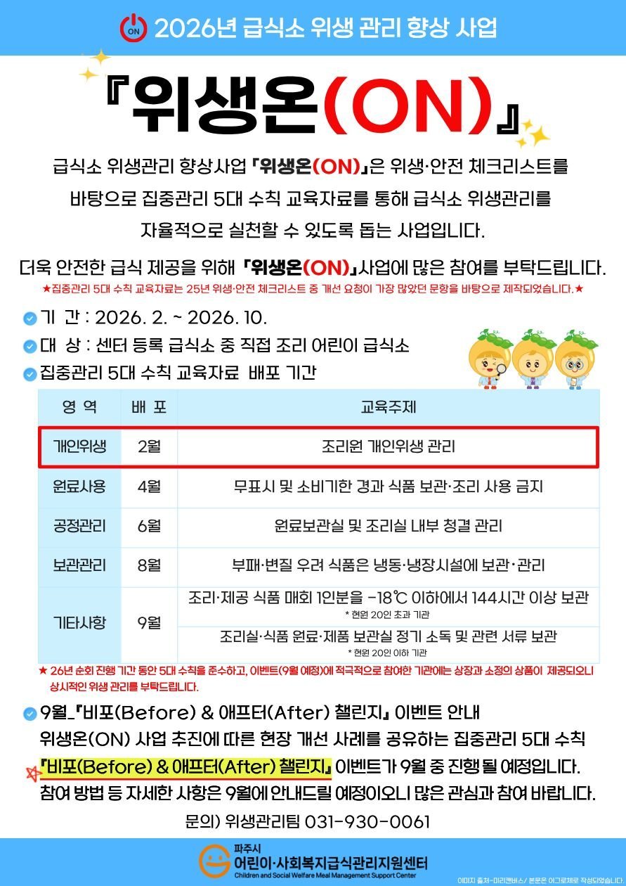 [금요저널] 파주시 위탁기관인 파주시 어린이·사회복지급식관리지원센터는 관내 급식소의 위생 관리 역량 강화를 위해 급식소 위생 관리 향상 사업 ‘위생 온’을 2월부터 10월까지 추진한다.
