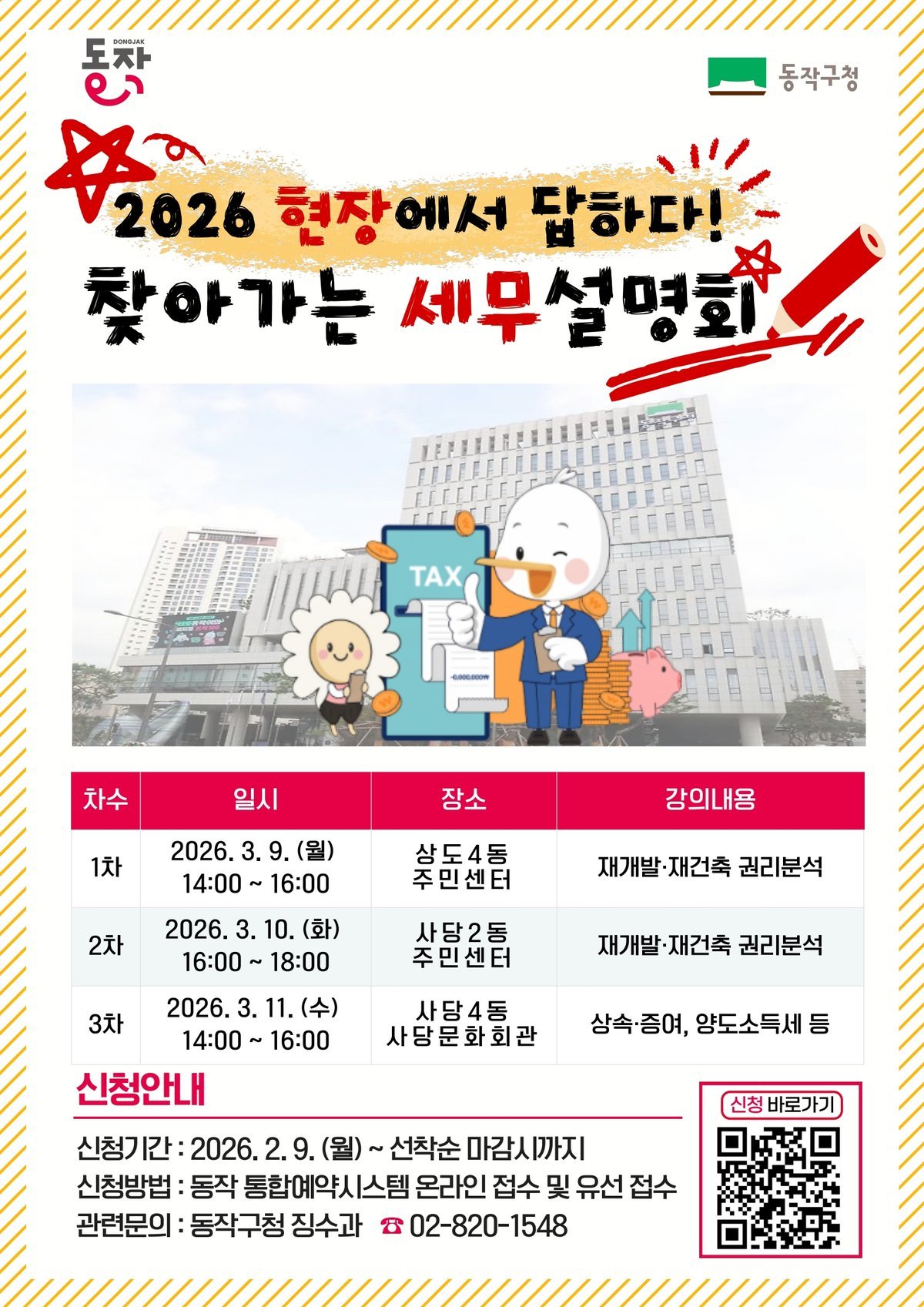 [금요저널] 동작구가 재개발·재건축이 활발히 진행되는 구 특성을 반영해 '2026 현장에서 답하다 찾아가는 세무설명회'를 개최한다고 밝혔다.
