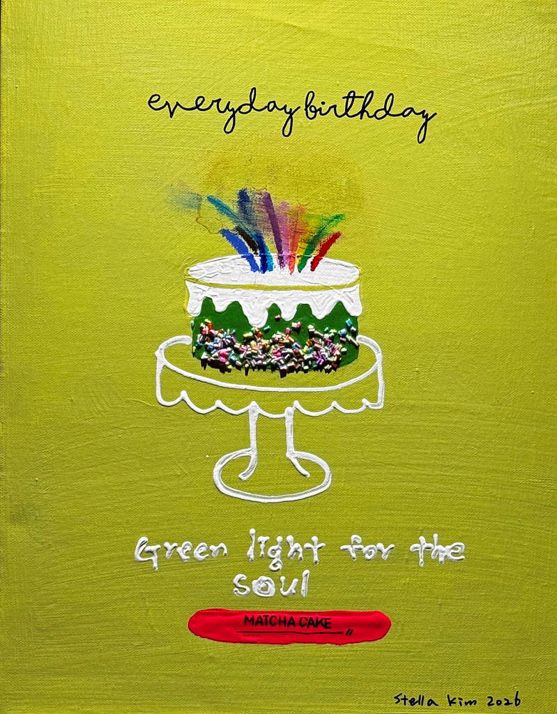 특히 많은 사랑을 받고 있는 ‘케이크 시리즈’는 매일이 생일처럼 축하받아야 할 하루라는 메시지가 있다. 화려한 비비드 컬러와 경쾌한 화면 구성, 위트 있는 상징을 통해 평범한 하루의 가치를 다시 바라보게 만든다. 케이크 위에 놓인 요소들은 단순한 장식이 아니라 살아가는 하루하루를 긍정하고 축복하는 시각적 은유다.