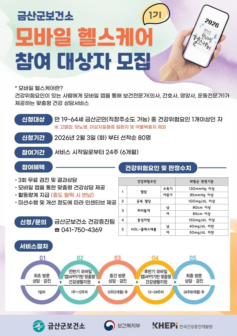 [금요저널] 금산군보건소는 2월 9일부터 2026년 모바일 헬스케어 1기 대상자 80명을 선착순 모집한다.
